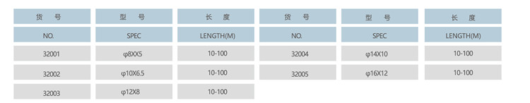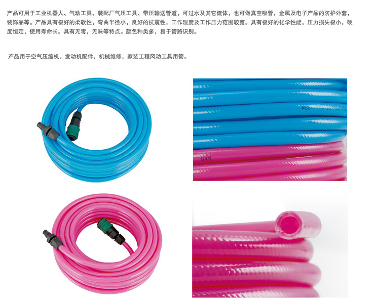 產(chǎn)品可用于工業(yè)機(jī)器人、氣動(dòng)工具、裝配廠氣壓工具、帶壓輸送管道,可過水及其它流體,也可做真空吸管,金困及電子產(chǎn)品的防護(hù)外套,裝飾品等。產(chǎn)品具有極好的柔軟性,彎曲半徑小,良好的抗震性,工作濕度及工作壓力范圍較寬。具有極好的化學(xué)性能,壓力損失極小,硬度恒定,使用壽命長(zhǎng)。具有無毒,無味等特點(diǎn)。顏色種類多,易于管路識(shí)別。